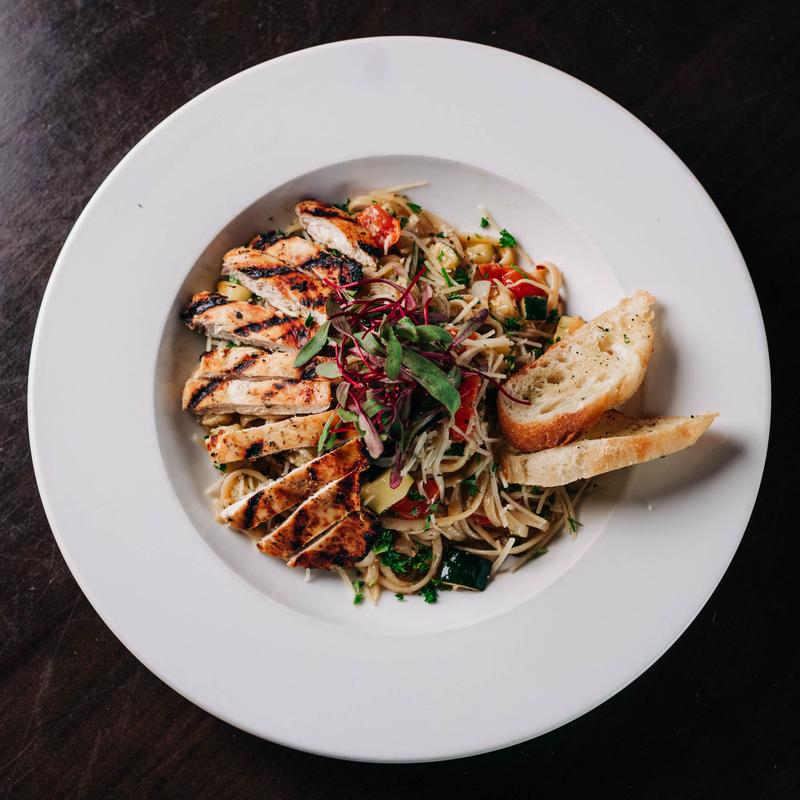 Grilled chicken, linguine, garlic, zucchini, cherry tomato, parmesan, beurre blanc, crostini.