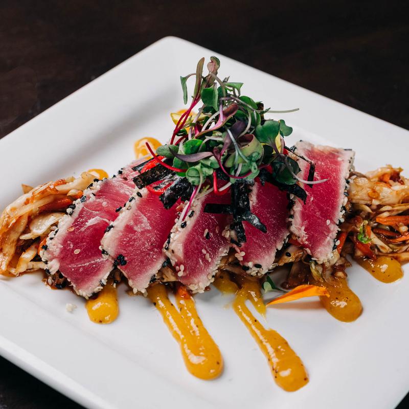 Sushi grade-sesame seared ahi tuna, hoisin slaw, ginger-mango sauce, pickled fresnos, nori crisps.