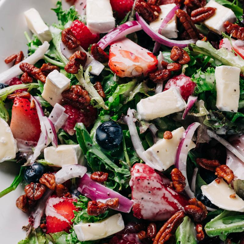 Small $7.95 | Large $14.95 • Spring mix, strawberries, blueberries, raspberries, red onion, brie, poppyseed dressing, glazed pecans