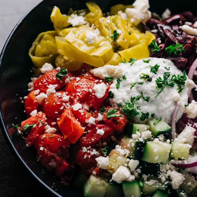 Couscous, cucumber, roasted tomato, kalamata olives, feta, red onion, pepperoncini, tzatziki sauce, grilled pita bread.
