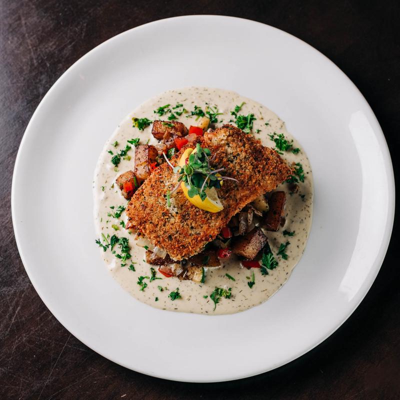 Parmesan crusted walleye, brown butter aioli, Yukon gold mash, asparagus.
