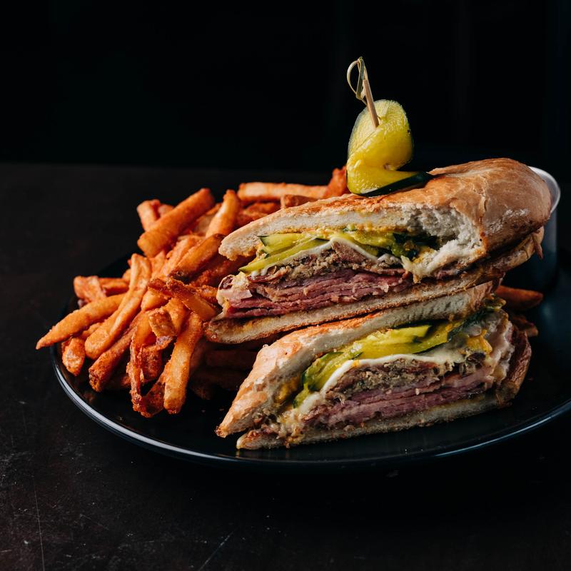 Grilled ham, pulled pork, hot mustard, house pickles, Swiss, pressed hoagie.