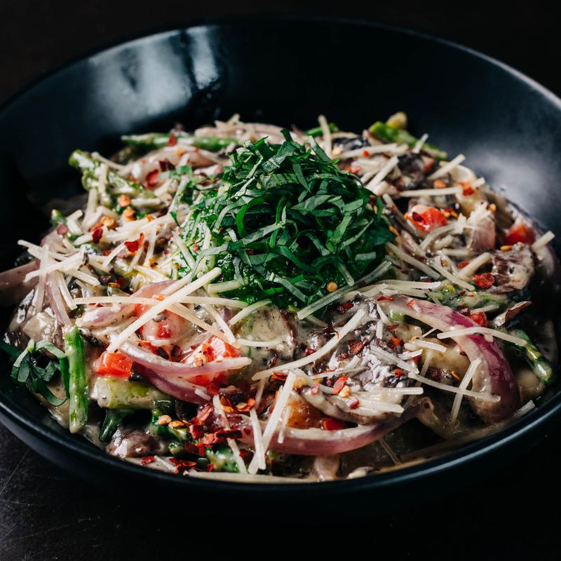 Mushrooms, asparagus, red onion, red pepper, pesto cream sauce, basil, parmesan, red pepper flakes.